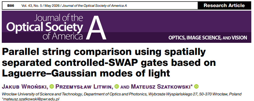 Jakub Wroński, Przemysław Litwin, and Mateusz Szatkowski, “Parallel string comparison using spatially separated controlled-SWAP gates based on Laguerre–Gaussian modes of light,” J. Opt. Soc. Am. A 43, B86-B91 (2026).